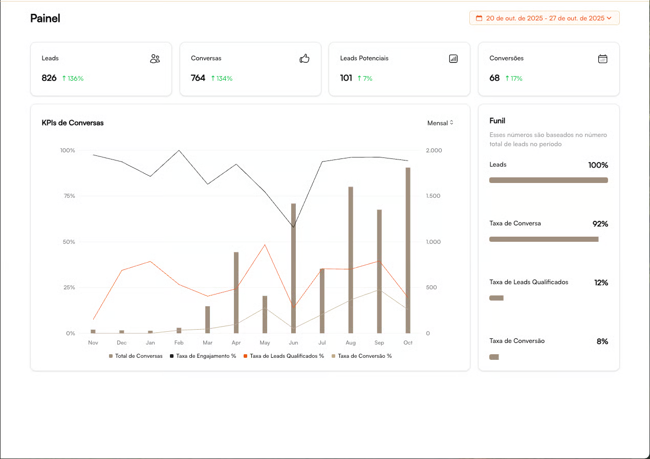 The Dashboard is the central command of your operation in Patagon AI. Here, you can track—in real time—the volume, engagement, qualification, and conversion of leads interacting with your agent through WhatsApp.
